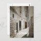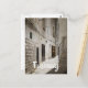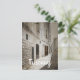 Postales de lavandería con mantas blancas colgadas para secarse al sol en la fachada de una casa de piedra blanca en una callejuela con escaleras de arenisca en una ciudad de Italia, creando una típica vista de la calle italiana/mediterránea con el texto "Toscana".