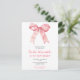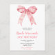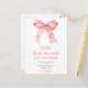 Tarjeta de invitación a una fiesta de cumpleaños bonita con una cinta de lazo de coqueta rosa. Las palabras se pueden cambiar para adaptarse a tus propios detalles o requisitos