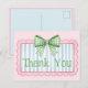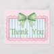 Esta linda tarjeta de agradecimiento presenta un marco rosa con rayas azules y blancas y coronada con un lazo de cuadros gingham verde y blanco elegante. Personalice con su elección de texto especial.