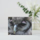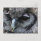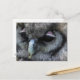 Postal con foto macro de un lindo búho gris con párpados rosas.