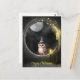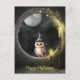 Un búho con un elegante gorra de brujas se sienta en la ventana redonda de una torre con un cielo nocturno y luna llena detrás. Las velas encendidas están cerca y las mágicas estrellas se agitan cerca de ella.