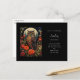 Postal de cumpleaños con una lechuza de aspecto fresco con una mirada penetrante. Luna llena en la parte de atrás con un jardín de flores rojas.