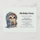 Invitación postal de la fiesta de cumpleaños con un lindo ilustracion de búho en una bata de invierno y una bufanda sosteniendo un café caliente.
