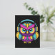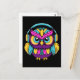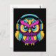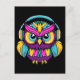 Búho retro multicolor groovy con auriculares. Esta lechuza personalizado tiene unas plumas coloridas y luminosas de color rosa, azul, amarillo, turquesa y morado. Lleva un juego de auriculares modernos y divertidos en amarillo y azul.