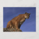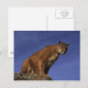 Un magnífico tiro de un león de montaña mirando hacia abajo con un cielo azul profundo en el fondo.