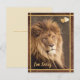Un cierre de la hermosa cara de león. Magnífica foto de gato grande. Con un texto que dice "Lo siento tanto" en un color beige. Es grandioso disculparse, sentir o expresar arrepentimiento, sobre todo por un mal hecho o error o por sentir tristeza, pena, compasión, lástima, desgracia o decepción, sobre todo porque algo desagradable ha ocurrido o se ha hecho. Con un fondo marrón oscuro, rústico y con texturas y barras doradas enmarcando el cuadro. Cada elemento se puede mover, cambiar el tamaño o eliminar. Fotografía de amantes de la naturaleza.