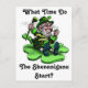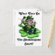 Un leprechaun irlandés sentado en un trébol de champú. Se pregunta '¿A qué hora empiezan los travesuras? ¡Genial para el Día de San Patricio!