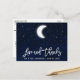 Tarjeta postal de agradecimiento de boda celestial con letras de pincel modernas. Cielo nocturno azul con estrellas y luna en acuarela.