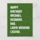 Una tarjeta de cumpleaños audaz de Lawn Mowing Legend con tipografía blanca limpia sobre un fondo de hierba realista.