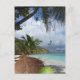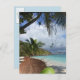 Una playa de arena con palmeras inclinadas, botes, agua azul, y una lima y un coco en primer plano.
