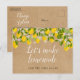 Esta divertida tarjeta de cambio de fecha de limones rústicos se puede personalizar con la información de su aplazamiento. La parte trasera tiene detalles adicionales, incluyendo su sitio web, con su dirección de retorno y espacio para la dirección de su destinatario. Perfecto para bodas, fiestas de soltera, baby showers, bautizos, fiestas de compromiso, celebraciones de aniversario, graduaciones, reuniones de cumpleaños y otros eventos especiales durante todo el año. Una forma perfecta de mantener informados a sus invitados. Diseñado por Thisisnotme