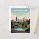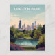 A lush, stylized vector landscape capturing Lincoln Park with a pond in the foreground and the prominent Chicago skyline (including the Willis Tower) rising dramatically in the background.