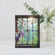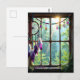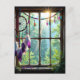 Una hermosa postal para saludar y mantenerse en contacto con un amigo o familiar. Una ventana rústica con un atrapasueños de plumas moradas colgando en la ventana junto con cristales brillantes y coloridos. La ventana da a una hermosa variedad de árboles y rayos de sol que brillan a través.