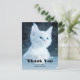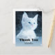 Tarjeta de agradecimiento con una adorable fotografía de un gatito blanco de pelo corto con ojos azules brillantes. Mirando a lo lejos. Patas cruzadas al estilo típico de los gatos.