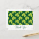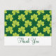 Gracias postal con un lindo patrón repetitivo con trébol verde oliva sobre un fondo verde oscuro. Mensaje personalizado en la parte de atrás.