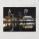 Una vista clásica de Columbus, el horizonte de Ohio y el paisaje urbano desde el parque Génova en el lado opuesto del río Scioto por la noche, con reflexiones sobre el agua y la luna sobre el cielo.