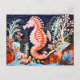 Postal Linocut de caballito de mar en el arrecife de cora
