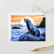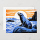 Locuta artesanal de un león marino encaramado en rocas costeras, silueta contra una vívida puesta de sol sobre el océano. Los contrastes audaces y las texturas intrincadas evocan la serenidad y la belleza natural.