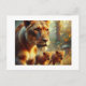 Una majestuosa leona camina protectivamente con sus dos cachorros a través de un bosque iluminado por el sol. Los tonos dorados y la iluminación tenue crean un ambiente cálido y sereno.