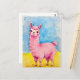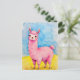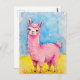 Un ilustracion adorable de una llama pintoresca y simpática de color rosa con una acuarela azul que mira al cielo y el césped amarillento y verde.