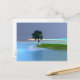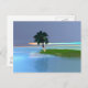 Postal con mi arte digital de una pacífica escena insular con palmeras rodeadas de un mar azul.