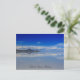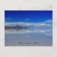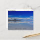 Postal de las asombrosas llanuras salinas de Uyuni en Bolivia con perfil de horizonte y montaña reflejada en las llanuras cubiertas de agua.