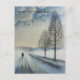 pintura de una silueta alejándose en la distancia en un paisaje invernal, pájaros volando en el cielo, colores azul y blanco. texto personalizable