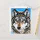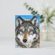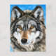 Una pintura acrílica de un lobo gris sobre un fondo azul.