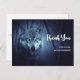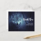 Gracias postal con una imagen de un lobo mágico místico parado en un bosque con una suave nieve cayendo por ahí. Es llamativo que los ojos azules llamen tu atención.