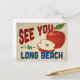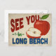 Una encantadora postal de viaje vintage de Long Beach California que incluye una hermosa manzana roja, junto con un divertido texto de estilo retro que dice, "Nos vemos en Long Beach"