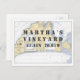 Para promocionar su negocio local de Viñetería Martha o para mandarlo a amigos y familiares, esta postal de Martha's Vineyard con latitud y longitud para la isla le dice a todos que están orgullosos de su "puerto de origen". El fondo azul, azul y blanco es la auténtica gráfica de navegación de la región. ¡La ciudad, la longitud y la latitud son todos personalizables por TÚ!