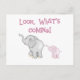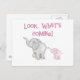A la madre embarazada que sea y a su padre le encantará esta linda camiseta de diseño de maternidad, bolsa de té, botones y otros artículos de embarazo con un elefante rosa y un texto que dice "¡Mira lo que viene!".