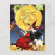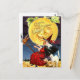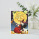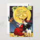 La vintage postal de Halloween muestra a una bruja con un vestido rojo con estrellas de plata, una capa negra y el tradicional gorra de brujas negro, adornado con cintas rojas. Ella está montando una escoba con la cabeza de conejo sobre ella. ¡Tan inusual! También hay un gato blanco en lugar de uno negro. Una calabaza gigante sonriente de luna llena está en el fondo. Imágenes de HTM