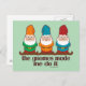 Los Gnomes me hicieron hacerlo. 3 gnomos de diferentes colores saliendo. Parodia/burla del diablo me hizo hacerlo. 3 imágenes gnome. Fondo verde/turquesa.
