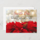 Un Navidad salva la postal con una fotografía festiva con un ramo de poinsettias rojas en el fondo. Luces de bokeh doradas brillantes en el fondo.