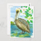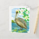 Postal decorada con un ave pelícano de color marrón oriental encaramado sobre una roca en un lago con árboles a lo lejos, bajo un cielo azul turbio ilustrado con tinta y acuarela. Inspirado por el ave estatal y la flor estatal de Luisiana. Puede editar o eliminar el texto para que se ajuste a sus necesidades.