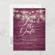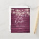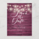 Este rústico salva la tarjeta de fecha con luces de cuerda de bonito y un guión elegante ahorra la fecha por encima de tus detalles en una tipografía elegante sobre un rústico fondo de paneles de madera de color burdeos. El reverso tiene detalles adicionales para guardar la fecha, incluido el sitio web del boda, con la dirección de devolución y el espacio para la dirección del destinatario. Diseñado por Thisisnotme©