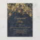 Invitación elegante de fiesta de compromiso azul marino con luces de cadena doradas brillantes y bokeh.