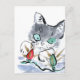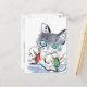 Parpadear, parpadear... El grisato gris está muy confundido con las luces rojas y verdes que parpadean Navidades para el árbol de vacaciones. Sumi-e, pintura con tinta de estilo japonés en color. Artista Ellen Miffitt @ Nine Lives Studio