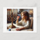 Un joven chica se sienta en una mesa, profundamente enfocada en la menorah iluminada que tiene ante sí. La luz tamizada de las velas ilumina la habitación, creando un ambiente cálido e íntimo.