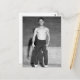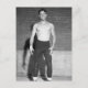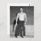 Esta postal contiene una fotografía vintage de un guapo, sin camisa, sonriente luchador universitario de los años 40.