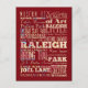 Hermoso diseño de tipografía que enumera atracciones y lugares famosos de Raleigh, Carolina del Norte. ¡Excelente recuerdo y recuerdo!