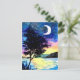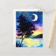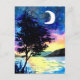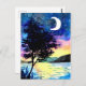 obras de arte tradicionales de acuarela que representan una colorida puesta de sol sobre colinas lejanas y un lago, mientras que la luna y las estrellas ya se pueden ver en el oscuro cielo nocturno sobre los árboles en una postal