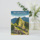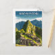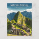Viaja al corazón del Imperio Inca con esta espectacular postal de viaje de Machu Picchu Perú. Esta ilustración gráfica cautivadora presenta las icónicas ruinas incas ubicadas en lo alto de los Andes. El diseño captura la escala impresionante de esta antigua ciudad, situada contra los dramáticos picos peruanos.