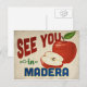 Una encantadora postal de viaje vintage de Madera California con una hermosa manzana roja, junto con un divertido texto de estilo retro que dice, "Nos vemos en Madera"