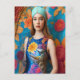 Una imagen de una mujer preciosa con tatuaje, banda verde en la cabeza y hermoso vestido azul. Esta es una obra de arte generada por IA con un tema floral.