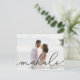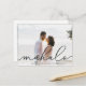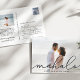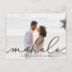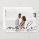 Una postal moderna y elegante de agradecimiento diseñada para acomodar tu foto boda horizontal o paisajista favorita con el saludo hawaiano "Mahalo" como un texto de escritura negra suave. está alineado lado a lado. Personalice con sus nombres y/o fecha de boda debajo. Las postales se invierten para mostrar su dirección de retorno con amplio espacio para el direccionamiento del destinatario, así como un mensaje preimpreso opcional y una foto adicional. Si prefiere agregar un mensaje manuscrito, simplemente elimine el texto de ejemplo que se muestra.