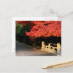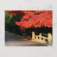 Las floridas hojas rojas de un gran arce japonés parado al lado de un pequeño puente.