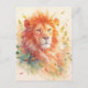 This stunning postcard features a powerful, close-up portrait of a lion with a vibrant orange and red mane. The lion's golden eyes gaze forward with intensity and grace, while its fur is rendered in warm, sun-drenched watercolor tones. Surrounding the lion is a whimsical swirl of autumn green and golden leaves that drift through the air, accented by delicate white light particles and soft peach watercolor splashes. The clean, cream-colored background creates a sophisticated feel that highlights the organic movement and rich textures of the big cat's mane. This postcard is a beautiful choice for sending a heartfelt message of strength, a thoughtful "thinking of you" note, or as a vibrant piece of nature-inspired wall art for a home office or study.