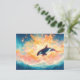 This stunning postcard features a majestic orca leaping gracefully above a deep blue sea. The killer whale's sleek silhouette is illuminated by a spectacular explosion of warm light, featuring vibrant orange, peach, and golden watercolor splashes that resemble a sun-drenched sky. Below, the churning waves are rendered in rich navy and indigo, with white sea foam catching the ethereal glow from above. The airy, painterly textures and high-contrast color palette create a powerful sense of freedom and natural wonder. This postcard is an ideal choice for sending an inspirational message of strength, a thoughtful "thinking of you" note, or for use as a vibrant piece of ocean-themed wall art.